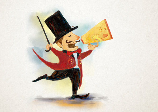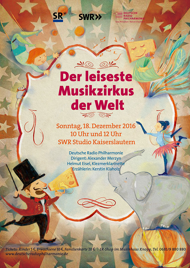 Die Illustration und das Plakat entstanden für das Familienkonzert „Der leistete Musikzirkus der Welt“ der Deutsche Radio Philharmonie im Jahr 2016. Im Mittelpunkt der Geschichte stehen Erna das Megaphone und der Zirkusdirektor Schorsch. Und was war eigentlich nochmal eine Flüstertüte?